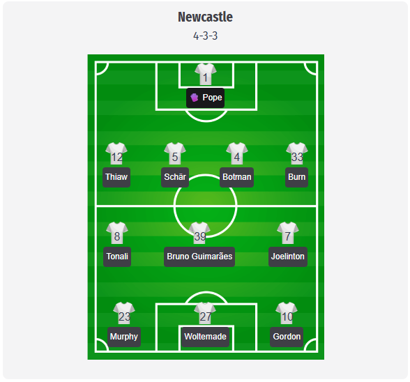 Newcastle are expected to line up in a 4-3-3 formation with Pope in goal. Thiaw, Schär, Botman, and Burn are expected to start in the back four from right to left, with Kieran Trippier missing out with a thigh injury and therefore unavailable at right-back. Tonali, Bruno Guimarães, and Joelinton are expected to start in central midfield, with Joelinton playing a key role in Howe’s game plan due to his physical presence and strength in one-on-one situations, even though he is currently lacking in direct scoring points in the league. Gordon, Woltemade, and Murphy are expected to form the attacking trio from right to left, with Woltemade likely to be preferred in the center of the front line, while Barnes, despite his brace against City, is still considered more of a super-sub. Overall, the absences of Trippier and attacking options Wissa and Osula significantly limit Eddie Howe’s rotation options in attack. Tactically, there is much to suggest that he will stick to the stable 4-3-3 formation in order to secure possession and width in the game, with Joelinton’s physical presence and the playmaking of Bruno Guimarães and Tonali being particularly important, especially in duels with strong opponents such as Leverkusen.