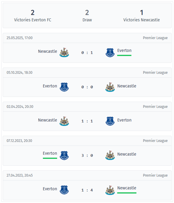 In a direct comparison, Everton has had a slight advantage in the last five encounters, with a record of 2 wins, two draws and one defeat, with results such as a 1-0 away win in Newcastle in May 2025, a 3-0 home win in December 2023, a 1-4 defeat for Everton in April 2023 and a 0-0 draw in October 2024. In all of these games, no more than 1.5 goals were scored before the break, and Everton did not score in the first half in any of these encounters, suggesting a rather cautious start with a lot of tactical probing. After the break, however, Everton were regularly more dangerous. In the last three encounters, the Toffees scored in the second half, while Newcastle conceded at least one goal after the break, suggesting that Everton are improving in terms of fitness or tactics. One possible explanation is that David Moyes makes specific adjustments to his team at halftime, or that the team becomes physically stronger, opening up spaces that Newcastle is unable to react to quickly enough on counterattacks or tactical changes. Therefore, a scenario with few goals before the break and a livelier second half is plausible for the upcoming game. Probable constellations are 0 to 1 goal in the first half and then more goals, for example, an Everton goal after the break, which makes markets such as goals in the second half or Everton scores after the break particularly interesting for betting and game predictions.