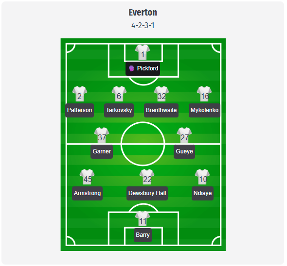 Moyes is likely to stick with his usual 4-2-3-1, with Pickford behind Patterson, Tarkowski, Branthwaite, and Mykolenko. The double six of Garner and Gueye should keep Everton compact and then set up Dewsbury Hall between the lines.