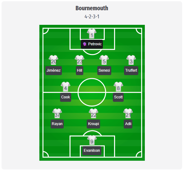 Iraola is likely to stick with the 4-2-3-1 that started the draw with Villa, with Petrovic behind Jiménez, Hill, Senesi, and Truffert. Cook and Scott should again form the double six, allowing Rayan and Adli to operate high and wide, while Kroupi works between the lines around Evanilson. Christie and Brooks look like the most important creative options off the bench. The absences are significant in the attacking rotation, with Kluivert still out after his knee surgery, Tavernier, Gannon Doak and Soler also unavailable, and Adams missing in midfield. That should keep the responsibility on Cook’s cover and Scott’s ball transport, and after his goal on his first start, put additional weight on Rayan’s running. If Iraola needs another target player, Ünal is an obvious late option.