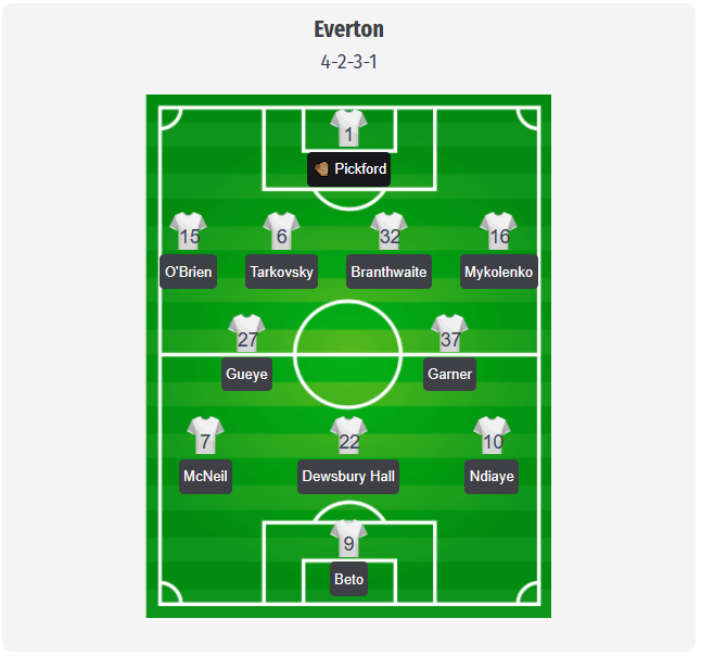 Everton is likely to line up in their usual 4-2-3-1 formation under David Moyes, though that is, of course, still just a prediction. Jordan Pickford – 1 is expected to start in goal, with a back four of Jake O’Brien – 15, James Tarkowski – 6, Jarrad Branthwaite – 32, and Vitaliy Mykolenko – 16. In defensive midfield, Idrissa Gueye – 27 and James Garner – 37 are expected to anchor the center and organize the press.