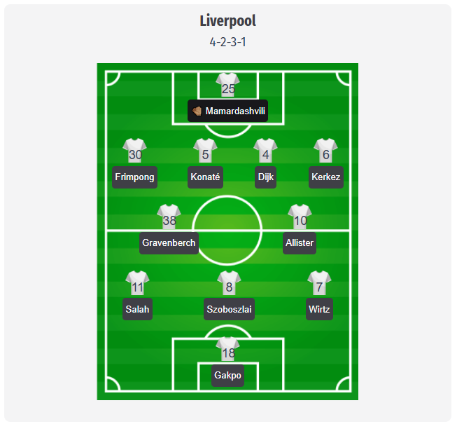 This projected Liverpool XI points to the familiar 4-2-3-1 formation, with Giorgi Mamardashvili – 25 likely to remain in goal as Alisson is still out. Jeremie Frimpong – 30 is the obvious choice at right-back, with Conor Bradley unavailable and Joe Gomez not yet fit, while Ibrahima Konaté – 5 and Virgil van Dijk – 4 should form the central defensive pairing, with Milos Kerkez – 6 on the left.
