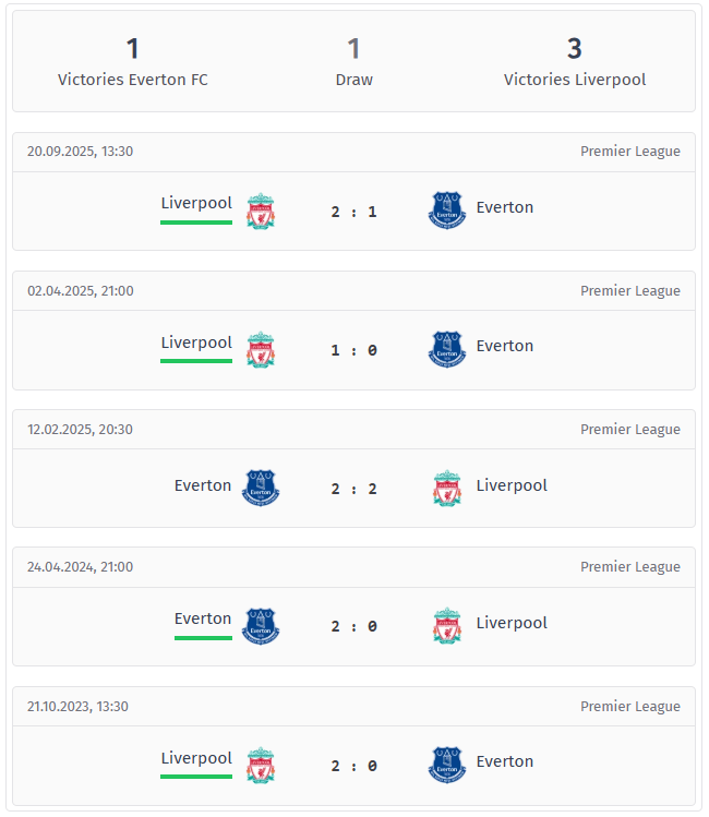 Liverpool has won three of the last five derbies, Everton one, and one ended in a draw. The most recent clash in September 2025 ended 2-1 for Liverpool, and the Reds also won 1-0 in April 2025. Everton’s bright spot in this series remains the 2-0 home win in 2024, which ended a long streak of futility in this rivalry.