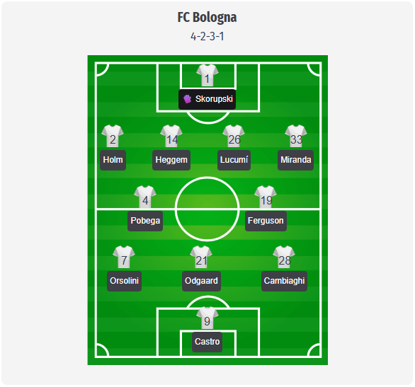 Bologna are expected to line up in their now familiar 4-2-3-1 formation, with Skorupski in goal behind a back four of Holm, Heggem, Lucumí, and Miranda in our predicted starting XI. In front of them, Pobega and Ferguson are expected to form a physically strong double pivot, while Orsolini, Odgaard, and Cambiaghi will play behind Castro, who is likely to retain his place as center forward. Key absences continue to shape this expected formation, with Casale, Freuler, and Bernardeschi all out injured, which is why our predicted defense remains unchanged and Cambiaghi starts on the left again. On the bench, we see Immobile and Dallinga as central attacking options, while Rowe and Domínguez are expected to provide depth and energy on the wings, all subject to official confirmation.