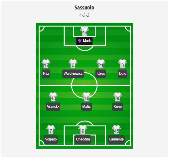 Sassuolo is likely to stick with a 4-3-3 under Fabio Grosso, with Muric expected to retain his place in goal. In front of him, a back four of Paz, Walukiewicz, Idzes, and Doig fits the pattern so far, with Matic sitting in front of the defense as cover, while Vranckx and Kone enliven the center with their running strength and ball carrying. Doig provides additional width on the left, while Paz tends to stay a little deeper. In attack, Laurienté and Volpato should support Cheddira as the central reference point. It is important to note that this is a predicted line-up, as Sassuolo still has several players out: Romagna, Pieragnolo, and Coulibaly limit the options in defense, Berardi is out with a thigh injury, and Skjellerup is also unavailable, meaning that the creative responsibility falls even more heavily on Laurienté and Volpato. Pinamonti and Thorstvedt remain realistic alternatives from the bench, which could change the attacking structure as the game progresses.