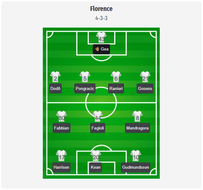 In midfield, Giovanni Fabbian – 80, Nicolò Fagioli – 44, and Rolando Mandragora – 8 could feature, a trio that would provide Fiorentina with both ball control and runs into space. Further up front, Jack Harrison – 17, Moise Kean – 20, and Albert Gudmundsson – 10 are expected to form the attacking trio. Tariq Lamptey remains sidelined, leaving the options at right-back thin.