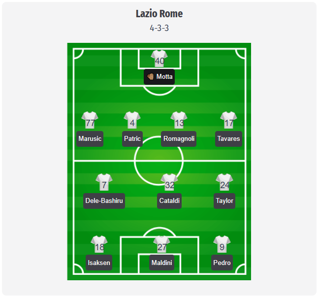 Lazio is expected to line up in Maurizio Sarri’s usual 4-3-3 formation, though this is initially just a prediction. Edoardo Motta (No. 40) is expected in goal, with Adam Marusic (No. 77), Patric (No. 4), Alessio Romagnoli (No. 13), and Nuno Tavares (No. 17). In midfield, Danilo Cataldi (No. 32) is set to anchor the defense, flanked by Fisayo Dele-Bashiru (No. 7) and Kenneth Taylor (No. 24).