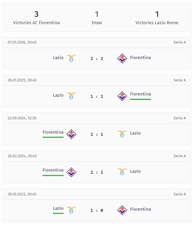 The recent record favors Fiorentina, who have won three of the last five matches. Lazio secured one victory, and the other match ended in a draw. The most recent encounter in January 2026 ended 2-2 in Rome, which fits well with the overall picture. Four of the five most recent matches featured at least three goals, but four also had fewer than 3.5, indicating that the games were generally close.