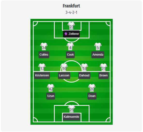 Eintracht are expected to stick with their familiar 3-4-2-1 formation. In this predicted line-up, Zetterer will start in goal ahead of Santos, with Koch in the center of a back three flanked by Collins and Amenda. Kristensen and Brown will occupy the wings, Dahoud and Larsson will anchor the center, and Uzun and Doan will operate behind Kalimuendo between the lines. However, due to the internal debate about the goalkeeper position, this decision could still be reversed in favor of Santos at short notice. Key absences characterize this possible starting eleven: Farès Chaïbi is away with Algeria, while Burkardt and Batshuayi are still missing, so Kalimuendo is very likely to be the central striker, and Uzun has a good chance of starting. Baum and Chandler are missing in defense, which effectively secures Brown and Kristensen’s roles on the wings. In midfield, Skhiri is not expected to be back in action after his short break following the tournament, and Bahoya has recently been ill, so this prediction is based on Dahoud and Larsson as the main axis in the center. Götze, Ebnoutalib, and possibly Amaimouni-Echghouyab could provide fresh impetus from the bench if Toppmöller wants more creativity in attack.
