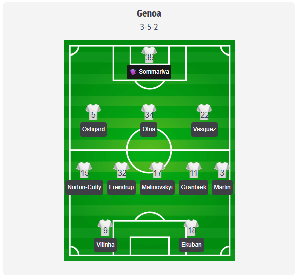 For their next Serie A outing, Genoa are expected to stick with a back three in our predicted line-up under De Rossi, with Sommariva in goal behind a trio of Østigård, Otoa, and Vásquez. Norton-Cuffy and Martín should operate as aggressive wing-backs, allowing the formation to drop into a back five when under pressure. In midfield, we see Frendrup in the center, with Malinovskyi and Grønbæk providing creativity and goal threat, while Vitinha should link up with Ekuban in attack, combining movement and physicality. With Siegrist out with a broken finger, Onana away with his national team, and Messias missing due to a calf injury, Carboni, Cornet, and Colombo appear to be the most likely options to come off the bench.