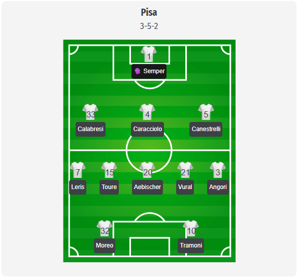 Pisa are likely to stick with Alberto Gilardino’s back three in a 3-5-2, so our predicted line-up sees Semper in goal, protected by Calabresi, Caracciolo, and Canestrelli. Leris and Angori are expected to operate as aggressive wingbacks, while Toure, Aebischer, and Vural form a compact central trio. Up front, Moreo and Tramoni are expected to start as a mobile duo rather than as fixed target players. This is a projected starting eleven, and injuries will shape it. Akinsanmiro is with Nigeria at the Africa Cup of Nations, which means the loss of a midfielder in whom Gilardino has recently placed increasing trust. Nzola is also in his national team’s squad and is unlikely to be available. Stengs, Meister, Lorran, and teenager Buffon could come off the bench if Pisa find themselves trailing.