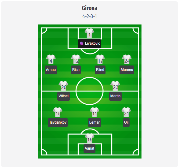 Girona are expected to line up in a 4-2-3-1, with Livakovic in goal behind a back four of Arnau, Reis, Blind, and Moreno. In this predicted starting eleven, Witsel and Martín form the double six, which should provide balance so that the three attacking midfielders can move freely. Tsygankov is likely to start on the right after his recent rise in form, with Lemar in the center and Gil on the left. Up front, this projection points to Vanat as the lone striker, as both Ruiz and Stuani are unavailable. The long-term absences of Portu and Van de Beek, as well as Ounahi on international duty, leave Míchel with few alternatives between the lines, so Asprilla and Solís could remain on the bench as super-sub options. This is a preliminary, unconfirmed starting lineup, so minor adjustments are possible before kickoff.