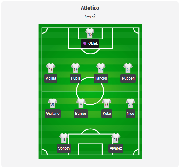 Interestingly, Atlético are expected to stick with their familiar 4-4-2, very similar to the formation that beat Valencia. A predicted starting eleven would see Oblak in goal, with Molina, Pubill, Hancko, and Ruggeri in defense, Barrios and Koke as the directing midfielders, Simeone and González on the wings, and a striking duo with Sorloth as the reference striker alongside the more mobile Alvarez. In defense, the injuries to Giménez and Lenglet, as well as Llorente’s thigh problem, will likely force a lineup in which Hancko and Pubill form the center-back pairing, Ruggeri moves inside when needed, and Molina provides width on the right. Cardoso has been limited by injuries this season, so Griezmann, Baena, and Almada could be the main alternatives from a very competitive bench in this predicted lineup, again with the caveat that this is not a confirmed starting XI.