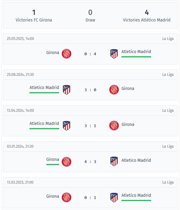 Atlético Madrid has clearly had the upper hand in the last five head-to-head matches, with four wins and one victory for Girona and no draws. The most recent match in May 2025 was the most decisive, a 4-0 away win that completed a series of three consecutive Atlético victories. Across these last three encounters, the overall goal difference is 10-1, highlighting the one-sided trend. Girona’s only win during this period came at home in 2024, a 4-3 victory that, in retrospect, seems like an exception. Since then, Atlético has tightened its grip, winning the next two home games in 2024 by 3-1 and 3-0, a pattern that suggests that once Atlético was established, Girona struggled to replicate its own offensive momentum against an increasingly confident opponent. The distribution of goals after the break is also striking, with Atlético largely dominating the second halves, scoring in all five games after the break, and Girona never able to outscore them in this period, losing the second half in four of these games. Four of the five encounters produced at least three goals in total, so this pairing is rarely close. In Girona, the three most recent encounters ended 0-1, 4-3, and 0-4, averaging about four goals per game, and in two cases, Atlético scored at least three goals. The visitors are traveling with a three-game winning streak behind them, while Girona goes into the next match with the visible burden of breaking both the goal and result trends.