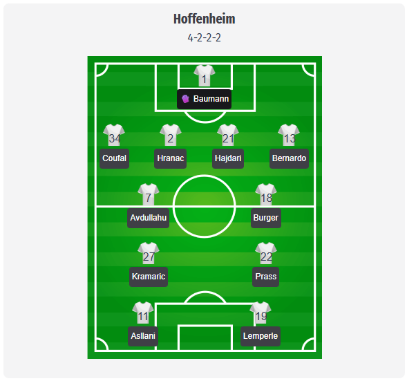 Ilzer is likely to stick to his usual 4-2-2-2, with Baumann behind a back four of Coufal, Hranac, Hajdari, and Bernardo. The double six of Avdullahu and Burger should secure the transition moments so that Kramaric and Prass can drift into the half-spaces as close, advancing creative players behind the two strikers Asllani and Lemperle. This is a plausible lineup, but not a confirmed one. With Machida and Frees out of action in defense, Ilzer may have limited alternatives at the back, with Akpoguma or Chaves the most obvious replacements if the predicted back four needs to be tweaked. Hlozek’s calf problem takes out a robust striker option, putting Berisha, Moerstedt, or Bebou more in the spotlight. Touré could also still be tied up with the AFCON, which would put Campbell or Damar within reach of additional minutes.