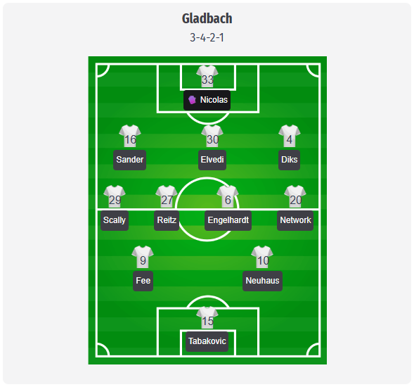 Polanski is likely to stick with a 3-4-2-1 formation, with Nicolas almost certain to start in goal while Cardoso remains sidelined with illness. In this prediction, Sander, Elvedi, and Diks form the back three, with the idea of pushing out wide at times and closing down the center. Scally and Netz are expected to provide width as wing-backs, making their timing on the back foot particularly important. Elvedi is expected to organize the line. In midfield, Reitz and Engelhardt seem like the obvious double six duo, with Neuhaus and Honorat planned as the two playmakers behind Tabakovic. With Kleindienst out after knee surgery, Tabakovic will be the main presence in the box, while Machino would be a solid alternative if they want more mobility. Hack is out and Ngoumou is still building up his fitness, so Reyna or Stöger could be the first attacking substitutes.