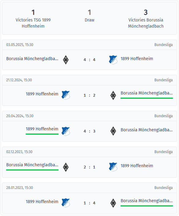 Borussia Mönchengladbach has the upper hand in the last five encounters, with three wins to Hoffenheim’s one, plus a draw. The most recent game in May 2025 ended 4-4 after a wild final phase.
