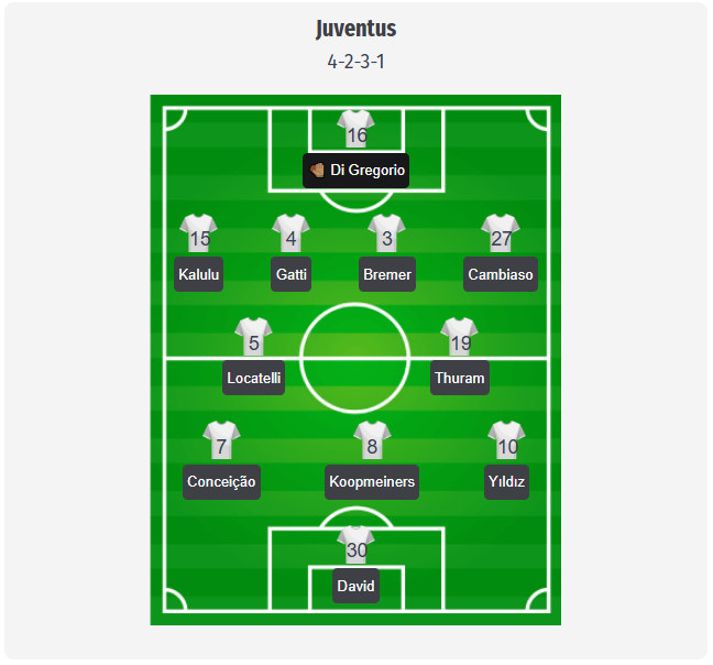 Spalletti is expected to stick with a 4-2-3-1, with Di Gregorio in goal and a back four of Kalulu, Gatti, Bremer, and Cambiaso.