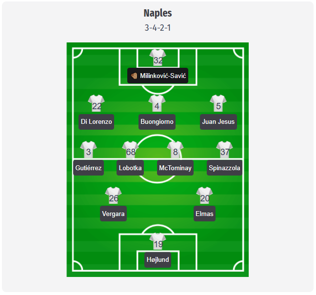 Conte is likely to stick with a 3-4-2-1 formation, with Milinković Savić expected to continue in goal while Meret is out with a shoulder injury. In defense, Di Lorenzo, Buongiorno, and Juan Jesus seem the most plausible trio given Rrahmani’s thigh and gluteal problems. In midfield, the absences of Anguissa and Gilmour reduce the options and move McTominay alongside Lobotka. If this system persists, Gutiérrez and Spinazzola should provide width, while Elmas and Vergara move inside to support Højlund and link up on the counter. The injury list remains extensive, with Neres facing further tests on his ankle and Politano out, plus De Bruyne unavailable, so fewer classic wing rotations are to be expected. Lukaku could be the most important alternative up front during the game.
