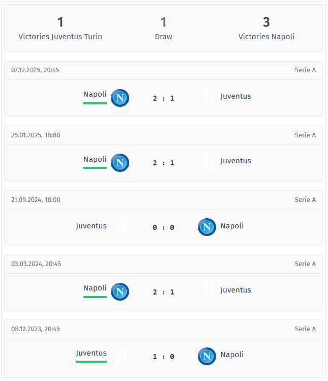 Napoli have the upper hand in the last five encounters, with three wins to Juventus Turin’s one, plus a draw. The most recent result came in December 2025, a 2-1 win for Napoli. There was also a 2-1 win in January 2025. Previously, 2024 saw another 2-1 win for Napoli and a 0-0 draw, while Juventus’ only win in this period was a 1-0 victory in 2023. There is a clear difference depending on the venue: Juventus Turin has not lost in its last two home games against Napoli, winning 1-0 in 2023 and drawing 0-0 in 2024. In Naples, however, Juventus has been beaten three times in a row in this five-game sample, each time 2-1 in 2024, January 2025, and December 2025. This away vulnerability is the most recurring pattern in the head-to-head comparison. Goals have been scored in controlled doses. All five encounters ended with under 3.5 total goals, and all five were under 1.5 goals at halftime, a streak of five games that continues regardless of form. Juventus scored in four of the five games, Napoli in three, but the games rarely open up. Even when Napoli wins, it is usually by a narrow margin and in a controlled manner rather than wildly. What is transferable: Both coaches are likely to focus on structure again, partly because of the personnel. Juventus will be without Vlahović, so the scoring burden will fall on David and Openda, while Yıldız and Koopmeiners will provide the connections. For Napoli, the goalkeeper question remains unresolved with Meret out, and absences such as Rrahmani, De Bruyne, Politano, Gilmour, and likely Anguissa and Neres could reduce their flow of play.