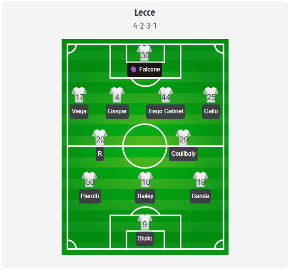 For the Serie A clash with Pisa, Lecce are expected to stick with their now familiar 4-2-3-1 formation, with Falcone in goal as Früchtl remains sidelined. The predicted back four is Veiga, Gaspar, Gabriel, and Gallo, partly because Jean and Pérez are still out with injuries. Ramadani and Coulibaly should once again form the double pivot in front of the defense, but this is only a predicted starting lineup. Pierret is also unavailable. In attack, the prediction is the same as for the game against Cremonese, with Stulic as center forward, supported by Pierotti, Berisha, and Banda, a trio that provides width and links the lines. Di Francesco may make slight changes to one of the wide roles, but the basic structure should remain similar. With no Lecce players suspended in Serie A, Maleh, Marchwinski, or Sottil are considered the most important alternatives.
