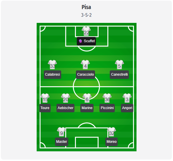 Pisa, still searching for a stable tactical balance in Serie A, are likely to stick with a 3-5-2 formation, with Scuffet in goal behind a back three of Calabresi, Caracciolo, and Canestrelli. Marin should once again be the central playmaker in midfield, flanked by Aebischer and Touré, while Piccinini and Angori provide width. Meister and Moreo are expected to lead the attack up front. Denoon is likely to be out with an ankle problem, Cuadrado and Stengs remain unavailable, and Nzola is suspended for three Serie A games after receiving a red card against Parma. This limits Pisa’s options on the right side and in attacking depth, which is why players such as Léris or Tramoni could be the most important alternatives from the bench.
