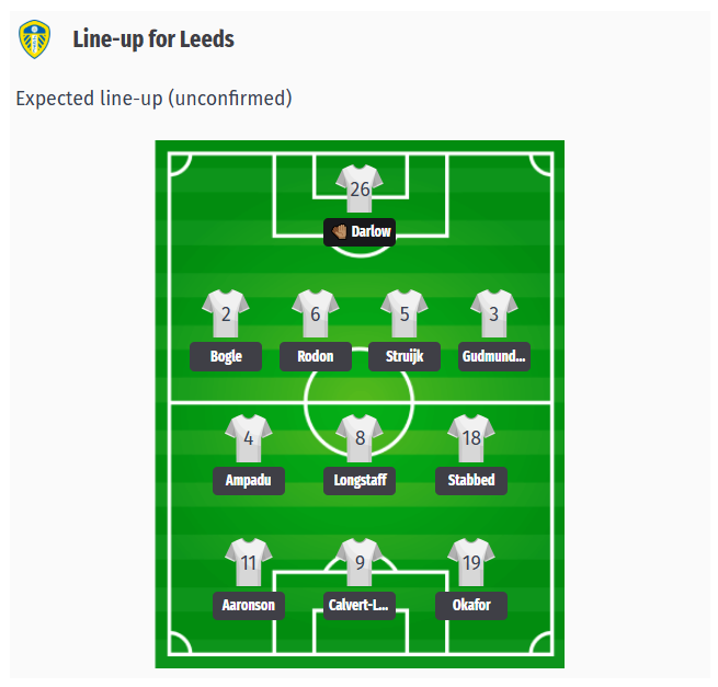 Leeds are expected to line up in their usual 4-3-3 formation, with Daniel Farke seeing little reason to make any major changes. However, the coach will have to do without key wingers: Daniel James is out for four to six weeks after suffering an ankle injury in training, while Wilfried Gnonto continues to struggle with calf problems. Karl Darlow is likely to start in goal, although Lucas Perri has returned to team training. In defense, the tried-and-tested pairing of Joe Rodon and Pascal Struijk could form the center, flanked by Jayden Bogle and Gabriel Gudmundsson. The midfield will probably be marshaled by Ethan Ampadu, supported by Sean Longstaff and Anton Stach. Dominic Calvert-Lewin and Noah Okafor are expected to lead the line, with Brenden Aaronson possibly occupying the third attacking position. Of course, this lineup remains speculative until the official announcement shortly before kickoff.