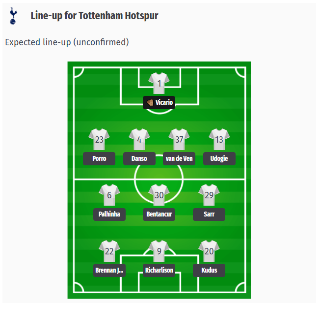 Thomas Frank is likely to field his preferred 4-3-3 system against Leeds, even if the personnel situation requires some interesting decisions. The absence of several key players due to Champions League regulations is particularly painful. Kulusevski, Maddison, and Tel are unavailable, which significantly limits creativity in attack. In central defense, Kevin Danso could start alongside van de Ven after Drăgușin was also ruled out. The midfield will likely be organized by Palhinha as a defensive midfielder, while Bentancur and Sarr are expected to take on the box-to-box roles. In attack, Richarlison will have to fill in for the injured Solanke, flanked by Johnson and the promising Kudus.