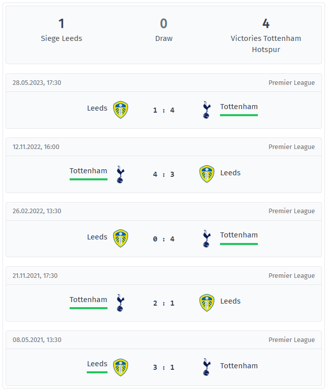The record of the last five encounters shows clear dominance by Tottenham. The Spurs have won four of the last five duels, with Leeds only celebrating once. That was in May 2021 with a 3-1 home win, but that was over four years ago. After this Leeds victory, Tottenham went on a remarkable run, winning all of the following four encounters and scoring at least two goals in each of them. The most impressive of these was the most recent match in May 2023, when Tottenham triumphed 4-1 at Elland Road. A look at the goal statistics reveals high-scoring encounters between the two teams. In all five games, at least three goals were scored, often significantly more. Leeds conceded goals in each of these games, while Tottenham was consistently successful. The Spurs scored at least two goals in each of the last four encounters.