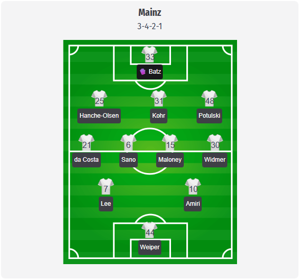 Mainz are expected to stick with Urs Fischer’s three-man back line, effectively a 3-4-2-1 that can drop into a back five without the ball. Batz starts in goal behind Hanche-Olsen, Kohr, and Potulski, who operate as center backs. Fullbacks da Costa and Widmer are expected to provide width and start the pressing on the wings, while keeping the center compact. In central midfield, Sano and Maloney are expected to form a strong running duo, with Lee and Amiri operating between the lines behind Weiper as the lone striker. This remains a predicted lineup, not a confirmed one, so Fischer could still adjust one or two positions. Injured regulars Zentner, Leitsch, Dal, Mwene, Caci, and Kawasaki are not expected to feature.