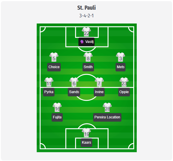 St. Pauli are expected to stick with a 3-4-2-1 formation, as predicted in the line-up, with Vasilj behind a back three of Wahl, Smith, and Mets. Sands and Irvine should once again form the midfield axis, with Pyrka and Oppie providing width on the wings, while Fujita and Pereira operate between the lines. Up front, the in-form Kaars is the obvious candidate for the role at the top after his recent Bundesliga goals. This is only a predicted lineup, and late changes are always possible. With Spari still out, Vasilj remains the natural choice in goal, while Nemeth’s continued absence confirms Wahl, Smith, and Mets as the predicted back three. From the bench, Saliakas, Ritzka, Metcalfe, or Afolayan could realistically be brought on to adjust the width, pressing intensity, or offensive profile during the game.
