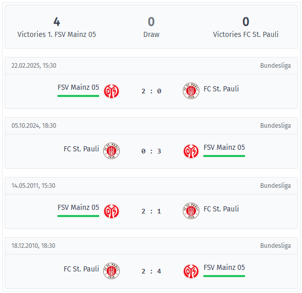 Mainz has taken all twelve points in its last four Bundesliga encounters. The overall record is 11:3, which underscores how one-sided this matchup has been so far. There have been no draws, every game has produced a clear winner, at least two goals have been scored in every game in this series, and Mainz has never been behind at the end, so St. Pauli is still looking for a starting point here. In February 2025, Mainz won 2-0 at home, following a 3-0 away win in 2024. These consecutive results mean that St. Pauli has not scored in the last two encounters, after the club was successful in the first two meetings in 2010 and 2011. The more recent pattern suggests that Mainz now controls both penalty areas much more comfortably. Home and away splits hardly change this story. Mainz has won twice at home and twice away, scoring at least two goals in each game. Mainz also scored in the second half in all four games, while St. Pauli always conceded goals after the break. This consistent late effectiveness suggests that Mainz finishes games with more physical and tactical clarity. Three of the four duels have produced at least three goals, with only the February 2025 encounter ending 2-0. The history between the teams therefore suggests open games rather than close draws, and given St. Pauli’s record of four consecutive defeats in this direct comparison, psychological pressure could also play a role, even though both squads have changed significantly over the years.