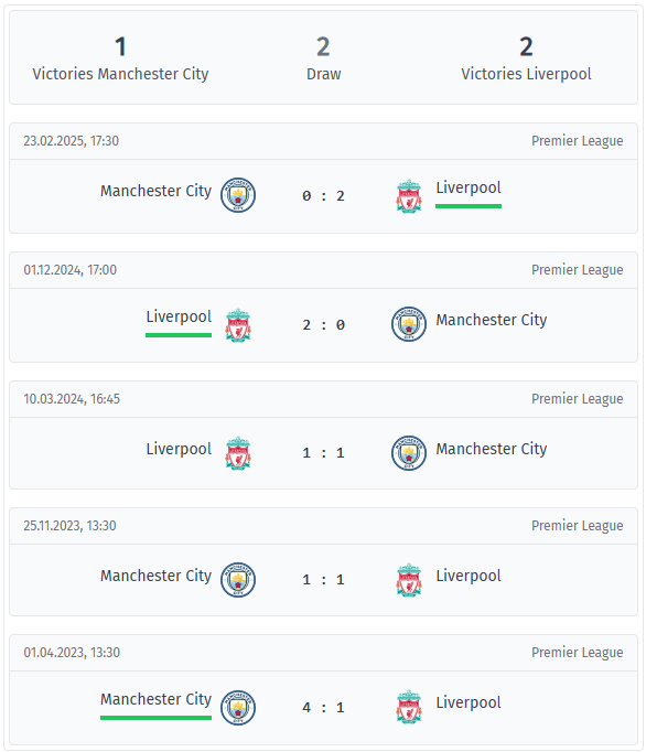 Liverpool have won two of the last five head-to-head matches, Manchester City one, with two draws. Liverpool’s two wins came in the most recent encounters in December 2024 and February 2025, both 2-0. All five games saw more than 1.5 goals scored, with both teams finding the net. Only once, in April 2023 when City won 4-1, were more than 3.5 goals scored; otherwise, the games remained relatively controlled. Manchester City conceded at least one goal in each of these five encounters, an unusually consistent vulnerability for Guardiola’s team. Liverpool scored before halftime in three consecutive games, often taking the initiative early on.
