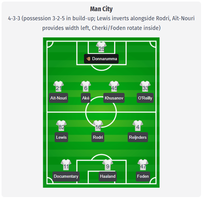 City are likely to start in their usual 4-3-3 formation, which shifts to a 3-2-5 when they have possession. Donnarumma is expected to start in goal, with Aït-Nouri pushing far forward on the left, while Lewis moves into the center and directs the build-up alongside Rodri. In front of them, Reijnders will provide the right passing angles, and up front, a trio of Doku, Foden, and Haaland is expected. At the back, this preview is clearly marked by absences, with Gvardiol, Dias, and Stones all missing, so Aké and Khusanov seem like the obvious center-back pairing, with O’Reilly helping out on the outside. Kovacic and Bobb are also unavailable, and Guéhi, Phillips, and Semenyo are not eligible to play in the Champions League. Up front, Haaland is still expected to start, even though there has been some talk recently about the risk of giving him a break. Marmoush would be an option.