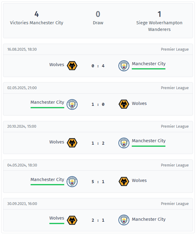 • The head-to-head record is clear: City have won four of the last five games without a draw, scoring every time (13:4 goals), and the Wolves have never kept a clean sheet.