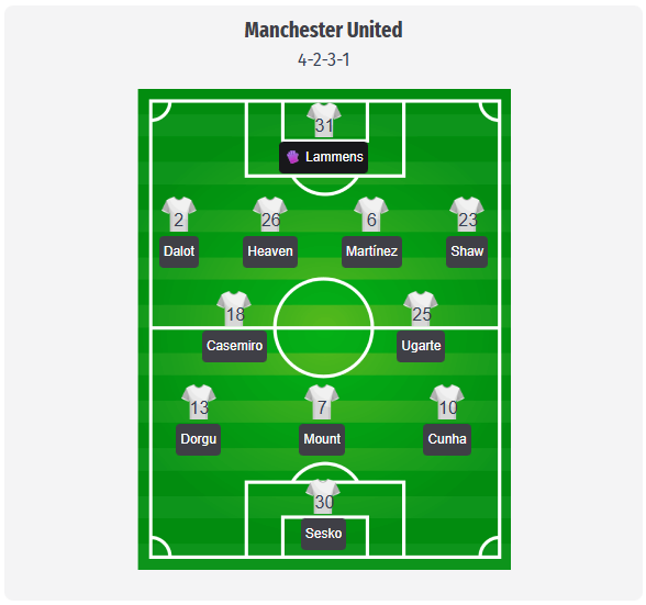 Manchester United are expected to stick with their now familiar 4-2-3-1 formation, with our predicted starting XI essentially based on the same team that beat Newcastle. Lammens is in goal, in front of him a back four of Dalot, Heaven, Martínez, and Shaw, Casemiro and Ugarte form the double six, with Dorgu, Mount, and Cunha supporting Sesko up front. This is still an expected lineup and not an official confirmation. Tactically, this prediction suggests a rather conservative defensive formation, with Casemiro providing cover and Ugarte pressing from deep, while Heaven pushes forward early to defend aggressively, something that Rúben Amorim has praised. Cunha is likely to cut inside from the right flank, leaving Dalot to cover the width, while Dorgu will tuck in from the left and work back to support Shaw in defensive duels on the flanks. Injuries continue to shape this expected starting lineup, with Matthijs de Ligt out injured and Noussair Mazraoui away at the Africa Cup of Nations, Heaven looks set to retain his place ahead of Yoro or Maguire. Further forward, Bruno Fernandes, Bryan Mbeumo, and Amad Diallo are missing, so Mount could once again take on the central creative role, with Cunha and Dorgu the main wing options and Zirkzee the most likely striker alternative from the bench.