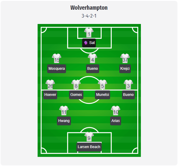 Our predicted starting lineup suggests that Wolverhampton are likely to stick with Rob Edwards’ 3-4-2-1 formation. Sa will be in goal behind a back three of Mosquera, Krejci, and Hoever, with one of the Buenos providing width on the flanks. In midfield, Gomes and Munetsi should stabilize the game, with Hwang and Arias likely to operate between the lines behind Strand Larsen, although Arokodare’s impact at Anfield could mean he retains the role of center forward. The predicted squad is missing Agbadou due to international duty, as well as winger Gomes and Doherty and Chirewa, who are all out, while Toti and Bentley are also not yet expected to return and Andre is suspended. This leaves the defense and wings looking thin, so players like Bellegarde, Lopez, and Gonzalez could once again cover multiple positions if Munetsi and Bellegarde’s recent problems in midfield limit their playing time.