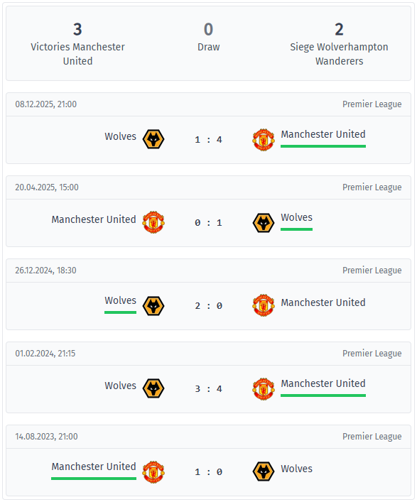 In the last five Premier League encounters, Manchester United have the slight edge, with three wins to Wolverhampton Wanderers’ two and no draws. This series came about in two distinct phases, with United winning the first two games, Wolverhampton responding with two wins in a row, and United striking back in December 2025. The games usually started cautiously and opened up after the break, with four of the five encounters level at halftime, but each time there was a winner in the end. A total of 16 goals were scored, an average of 3.2 per game, with Wolverhampton scoring in each of the last four encounters, while United conceded in four of the five games, so clean sheets are rare in this head-to-head comparison. Home and away patterns add another layer to the story, with the last two encounters at Old Trafford ending in draws, United narrowly winning in 2023 before Wolverhampton responded with a 1-0 victory in April 2025. The higher-scoring results came in Wolverhampton, where United won 4-3 in 2024 and 4-1 in December 2025, meaning their strongest performances in this fixture have so far come away from home. It is striking that Wolverhampton have never led at halftime in this series, even though the team won twice and scored in four consecutive games. Their influence was mostly evident after the break, suggesting a decline in concentration at United, even though United now feel as if they have reset the tone in this duel after their 4-1 win in December 2025.