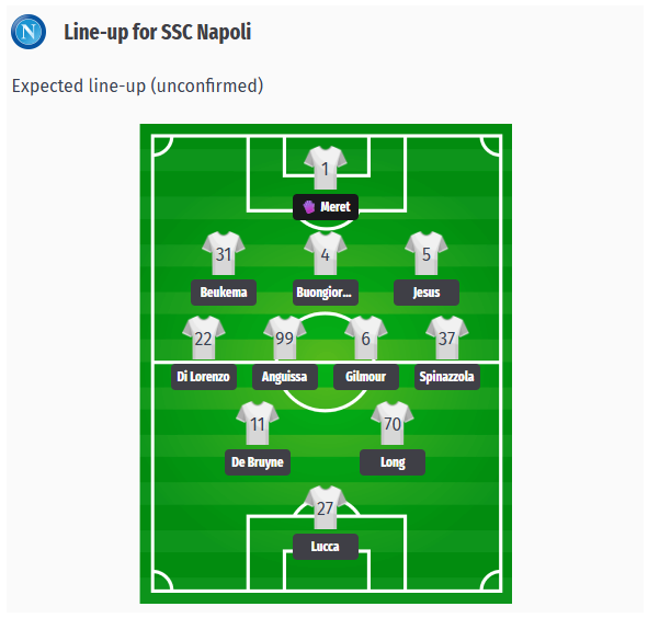 Antonio Conte is likely to stick with his usual 3-4-2-1 formation against Inter. Meret will be in goal, with Beukema, Buongiorno, and Juan Jesus forming the back three. Di Lorenzo and Spinazzola will provide width on the flanks, while Anguissa and Gilmour are expected to start in central midfield. Lucca is expected to start up front, as Højlund is doubtful and Lukaku is out with a thigh injury. De Bruyne and Lang could provide attacking impetus behind him. McTominay could be available as an option off the bench after recovering from injury. Lobotka remains sidelined with an adductor injury.