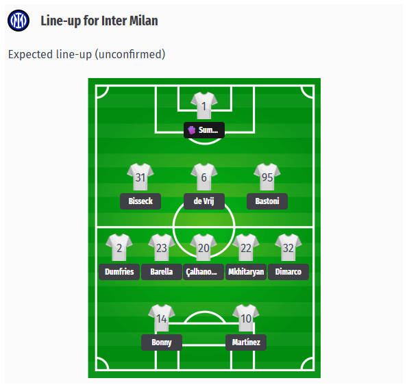 Inter are likely to line up in their usual 3-5-2 formation. Cristian Chivu is expected to field Bisseck, de Vrij, and Bastoni in defense, as Darmian remains sidelined with calf problems. Barella, Çalhanoğlu, and Mkhitaryan will form the midfield trio, while Dumfries and Dimarco will operate on the flanks. The situation up front remains exciting: with Thuram still out, Bonny could start alongside Lautaro Martínez again. The 21-year-old Bonny scored after six minutes in the first leg against Roma and has already collected three goals and three assists in his first seven Serie A games, meaning he is currently involved in more Inter goals than any other player. Frattesi, Zieliński, and Acerbi, among others, are on the bench, ready to come on if Chivu needs to make adjustments during the game.