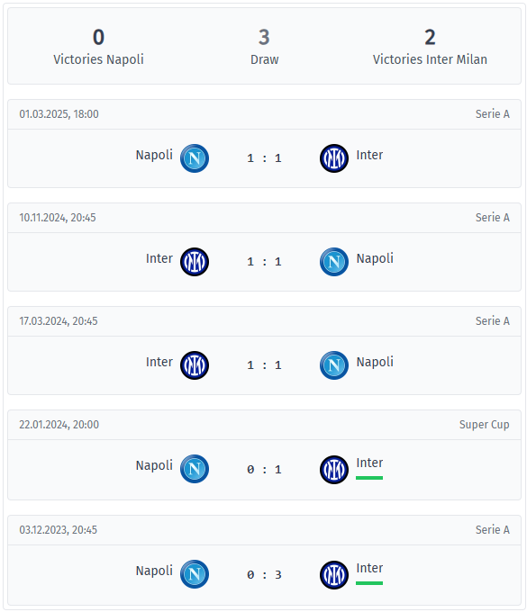 The record of the last five head-to-head matches clearly favors Inter: no wins for Napoli, two wins for Inter, and three draws. Inter scored at least one goal in all five games, while Napoli conceded at least one goal each time. The encounters were mostly low-scoring, with three consecutive games seeing a maximum of one goal at halftime, and all five games remaining under 3.5 goals. The last three matches ended 1-1, in March 2025 in Naples, in November 2024 in Milan, and in March 2024. Inter also won the Supercoppa final 1-0 in January 2024 and won 3-0 in Naples in December 2023. Since that 3-0 win, Napoli have been winless in this fixture, which could give Inter extra confidence, while Napoli are under pressure to end this negative run.