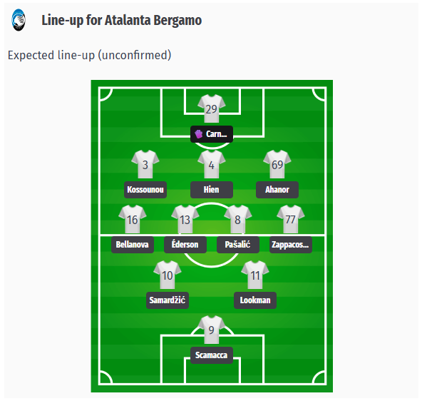 Raffaele Palladino is likely to start with his preferred 3-4-2-1 system. He emphasized that there are no fixed starters and that everyone has to earn their position in training, which is why the lineup remains speculative. Carnesecchi is expected in goal, with a back three of Kossounou, Hien, and Ahanor in front of him. Bellanova and Zappacosta are likely to start on the flanks of the back four, with Éderson and Pašalić expected to form the central midfield duo. Behind striker Scamacca, Samardžić and Lookman are expected to occupy the creative attacking positions. Bakker is out long-term with a cruciate ligament rupture, but otherwise Palladino has almost all his personnel options available to test the squad and set his first tactical priorities.