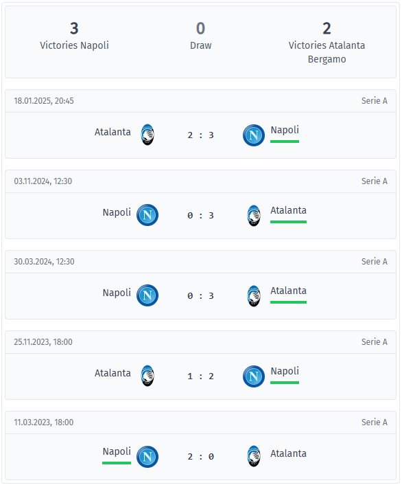 The previous direct duels between Napoli and Atalanta have been extremely clear-cut in their outcomes, with no draws in the last five encounters: Napoli won three times and Atalanta twice. In detail, Atalanta won both games 3-0 in March and November 2024, while Napoli won 2-1 away in November 2023, won 2-0 at home in the same year, and most recently prevailed 3-2 away again in January 2025. At least two goals were scored in all five games, with four of these matches seeing more than 2.5 goals, but at the same time, the last four games remained below 3.5 goals, indicating intense but not completely open exchanges. It is also striking that Napoli conceded at least one goal in four of these five encounters and rarely kept a clean sheet against Atalanta.