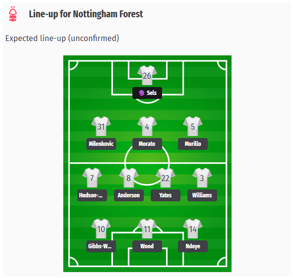 Postecoglou is likely to opt for a 3-4-3 formation. Sels will be in goal, with Milenkovic, Morato, and Murillo forming a back three. Williams will continue to replace the injured Zinchenko on the left, with Hudson-Odoi on the right. Anderson, who returns from international duty with confidence, and Yates are expected to start in central midfield. Gibbs-White, Wood, and Ndoye are likely to make up the attacking trio, although Wood is doubtful after picking up a knee injury in New Zealand. If he is unavailable, Kalimuendo would be the most likely replacement.