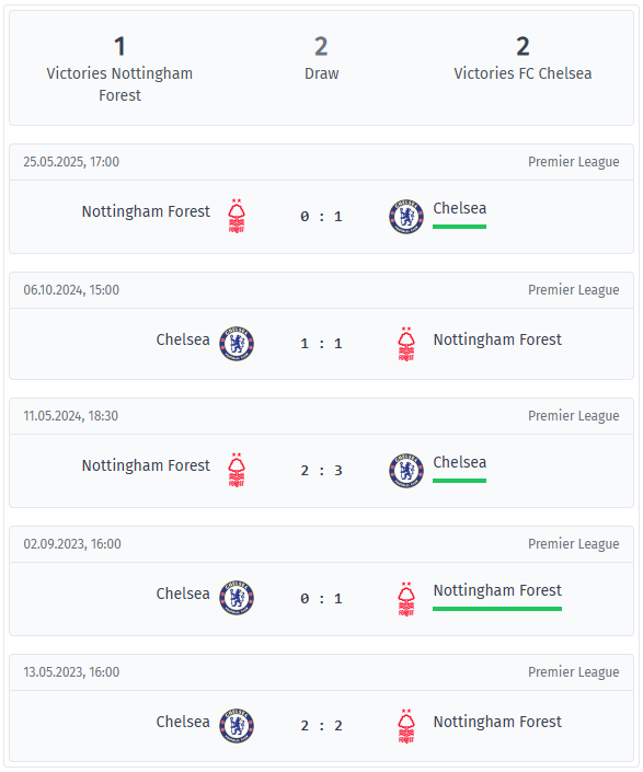 The record from the last five meetings slightly favors Chelsea with two wins, one win for Forest, and two draws. A clear pattern emerges in the course of the game: in 80 percent of cases, the score was tied at halftime, and four of the five games were decided in the second half. Forest scored at least one goal after the break in each of the last four head-to-head matches, while Chelsea conceded goals in the second half four times in a row. The most recent results underscore this trend: in May 2025, Chelsea won 1-0 at City Ground, in October 2024, the two teams drew 1-1 at Stamford Bridge, and in May 2024, Chelsea won 3-2 in Nottingham with all five goals coming after the break. This history suggests another close encounter, with little action in the first half and an increased likelihood of goals after the break.