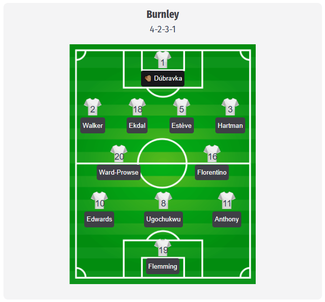FC Burnley projected lineup (4-2-3-1): Scott Parker is likely to once again rely on a compact back four, a defensive-minded double pivot, and three attacking midfielders behind a lone striker.