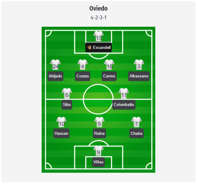 Almada is likely to field Oviedo in his usual system with a back four, double six, and a trio behind the striker, with Escandell behind a back four of Ahijado, Costas, Carmo, and Alhassane. The double six with Sibo and Colombatto will set the pace, while Hassan, Reina, and Chaira will operate between the lines and repeatedly target the half-spaces and wide areas. Up front, Viñas is most likely to be the target man for direct play and second balls.