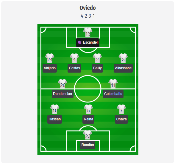 Oviedo are expected to line up in a familiar 4-2-3-1, with Escandell in goal behind a back four of Ahijado, Costas, Bailly, and Alhassane. In the double six, Dendoncker and Colombatto should provide stability with their size and composure in the first pass, while Hassan and Chaira come in from the wings, Reina operates between the lines, and Rondón is served as a classic reference striker in the center. This predicted starting eleven takes into account Carmo’s suspension in the league, Ejaria’s ongoing injury, and Lemos’ long-term absence. Cazorla, Viñas, Ilic, and Brekalo are plausible alternatives who would shift the team towards additional creativity or more pace, so it is quite possible that one of the three attacking midfield positions will be adjusted at short notice.