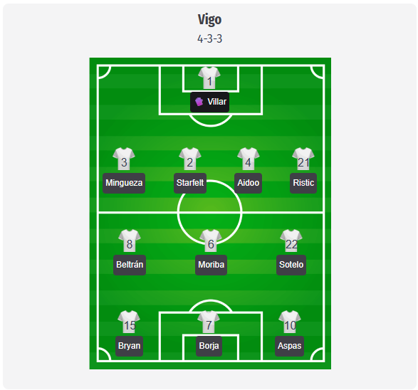 Celta are likely to start in a 4-3-3 again under Claudio Giráldez, with Villar in goal and a back four of Mingueza, Starfelt, Aidoo, and Ristic. Beltrán is expected to provide cover in midfield, with Moriba providing the necessary dynamism and Sotelo playing a more creative role. In attack, Bryan and Aspas are likely to support Borja, who will be the central reference point up front, from the wings and the half-space respectively. With no injuries reported, no obvious forced changes are expected to this predicted starting eleven, so it will be particularly interesting to see how early Giráldez turns to the bench. Swedberg and Cervi could offer another option between the lines, while Jutglà is available as an alternative to Borja. Mingueza, despite the transfer rumors, seems to remain a fixture after his strong run of appearances.