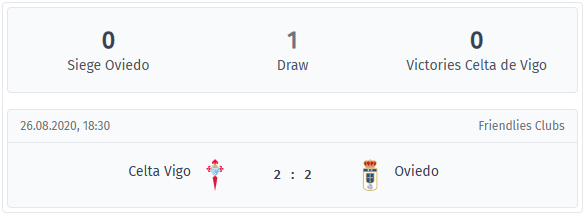 In the available recent data, there is only one direct match between Oviedo and Celta de Vigo, a friendly in 2020 that ended 2-2 in Vigo. This makes the head-to-head record completely even, with no wins for either side and one draw, so there is no historical indication that one club is clearly superior to the other. This match reveals a pattern in terms of goals scored. Both teams scored two goals and conceded two, with all final score metrics pointing to an open contest in which over 1.5, over 2.5, and even over 3.5 goals were covered in this one sample. This suggests that defensive control has not played a central role in previous encounters between these teams. However, this was a non-competitive club friendly and not a league game, so its significance is limited. There are no multi-game series to draw on, and psychologically, neither side can claim historical dominance, so the coaching staffs are likely to view the head-to-head record for this La Liga matchup as almost meaningless.